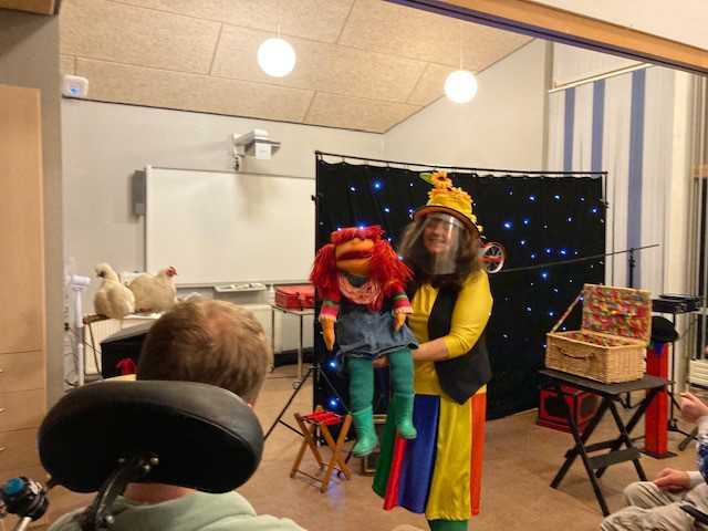 Henny tryllede for os, hun tryllede kaniner, høns og en due frem. Hun tryllede med farvede stykker stof, der pludselig blev til en farvestrålende paraply. Alle der havde lyst fik lov at hjælpe med at trylle og skulle man hjælpe Henny med et tryllenummer, var det vigtigt at have tryllehatten på og tryllestaven i hånden.